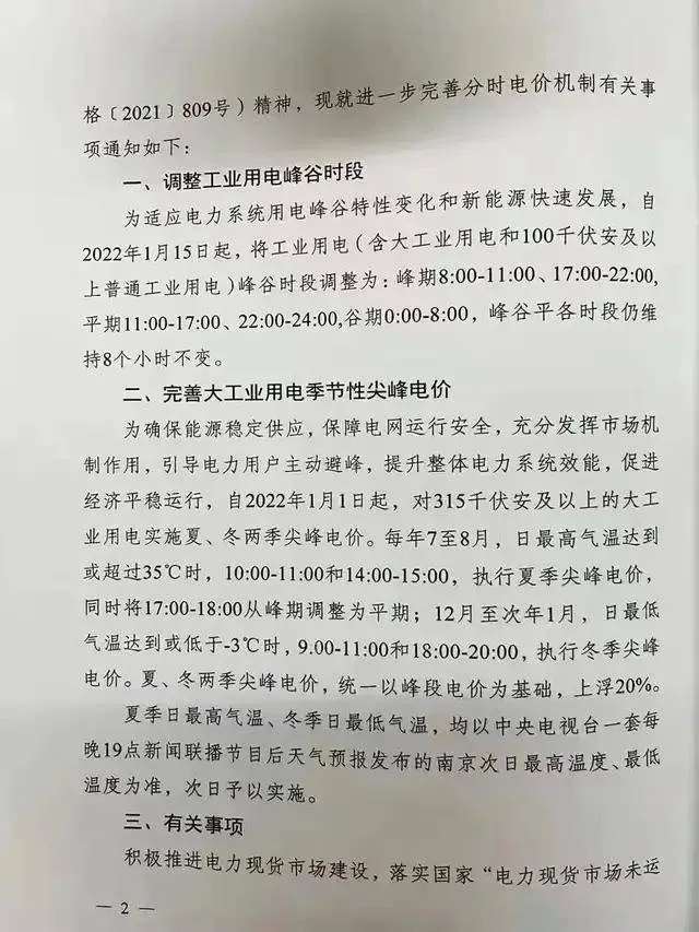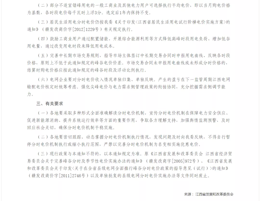 江西(xī)省發改委明(míng)确,高(gāo)峰時(shí)段電(diàn)價上(£∏shàng)浮50%,尖峰時(shí)段電(diàn)價在高(gāo)峰時(§↑ ★shí)段電(diàn)價基礎上(shàδ¶πng)上(shàng)浮20%,低(dī)谷電(diàn)價下(xià)浮50π↕☆%。10千伏及以上(shàng)工(gōng)商¶≠業(yè)及其他(tā)電(diàn)力用(yòng)戶自÷₹↕¥(zì)2022年(nián)1月(yuè)1日(rì)起執行 →"(xíng)。2024年(nián)1月(yuè)1日(rì)起,αα工(gōng)商業(yè)及其他(tā)電(diàn)力用(yγ♦òng)戶全部執行(xíng)分(fēn↕♠ )時(shí)電(diàn)價。