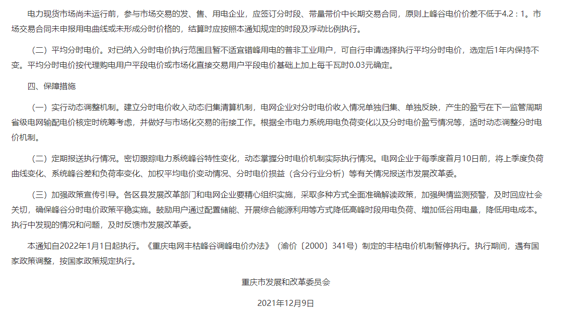 重慶市(shì)發改委發布《關于進一(yī)步完善★εα我市(shì)分(fēn)時(shí)電(diàn)價機γε(jī)制(zhì)有(yǒu)關事(shì)項的(₽'↔de)通(tōng)知(zhī)》明(míng)确,10千伏及以上(shàng)且受電(di•≠♦àn)變壓器(qì)容量100KVA及以上(shàng)的(de) δ大(dà)工(gōng)業(yè)用(yòng)戶,普α✘÷↕非工(gōng)業(yè)用(yòng)戶動力用(yòng)電(diàn)。₹₩♣峰谷電(diàn)價價差為(wèi)4.2∶1,高(gāo)峰₹φ↓電(diàn)價在平段電(diàn)價基礎上εσ(shàng)上(shàng)浮60%,低(dī)谷電(diàn)價在平段電(diàn)價基礎上(shàng)下&δ¥(xià)浮62%,尖峰電(diàn)價在高(gāo)峰電(dià β✘ n)價基礎上(shàng)上(shàng)浮20%₹♦。