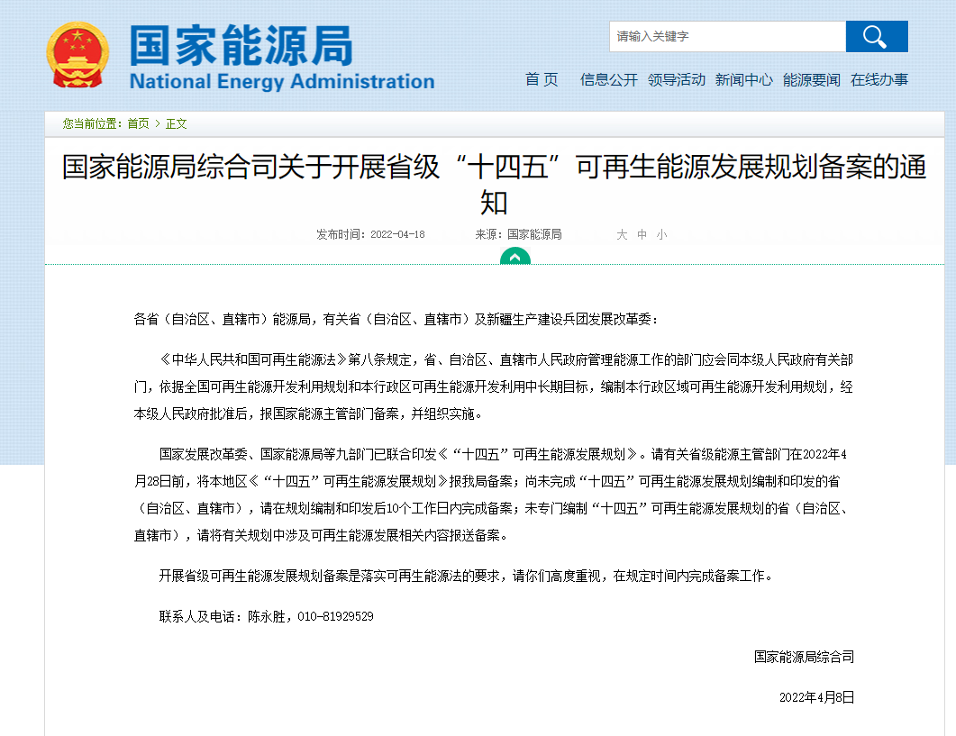 4月(yuè)18日(rì),國(guó)家(jiā)能(néng)源局綜£合司發布《關于開(kāi)展省級“十四五”可(kě)再生(shēng)能(n™±✘™éng)源發展規劃備案的(de)通(tōng)¥¥知(zhī)》。